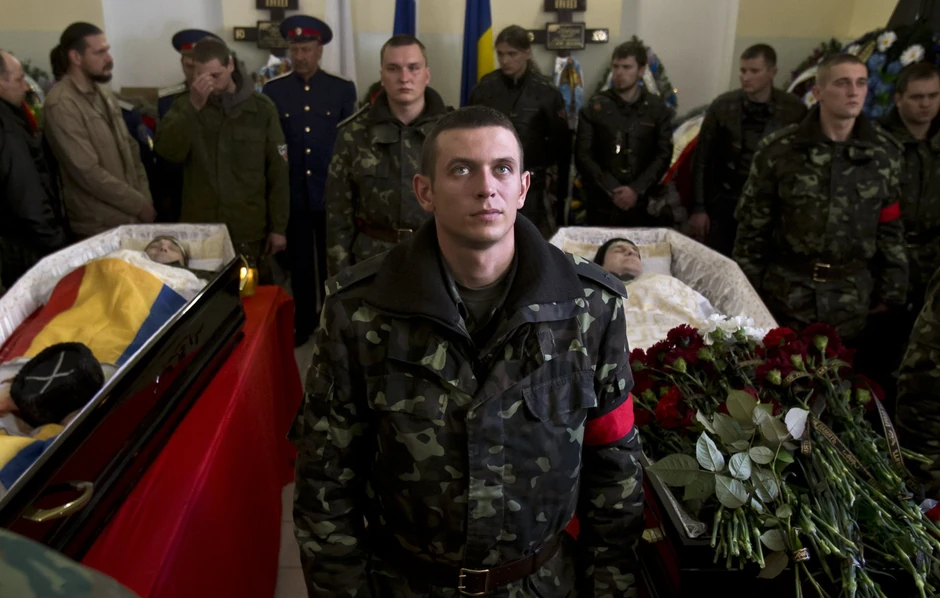 Na sredini vidimo ukrajinskog vojnika, koji stoji između mrtvačkih kovčega poginulog ukrajinskog vojnika 35-godišnjeg Sergeja Kokurina (desno) i 34-godišnjeg pripadnika ruske kozačke milicije Ruslana Kazakova (levo) tokom zajedničkog opela u Simferopolju.