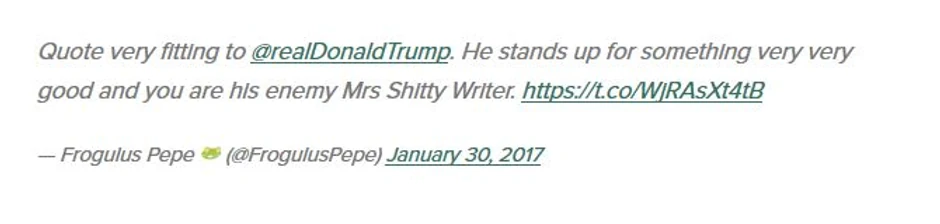 Rezultati izbora spisateljicu nisu sprečili da javno govori o problemima koji je brinu. Pa ni Trampova zabrana ulasaka u SAD ljudima iz sedam bliskoistočnih zemalja nije izostala, pa je retvitovala stvari poput ovih: