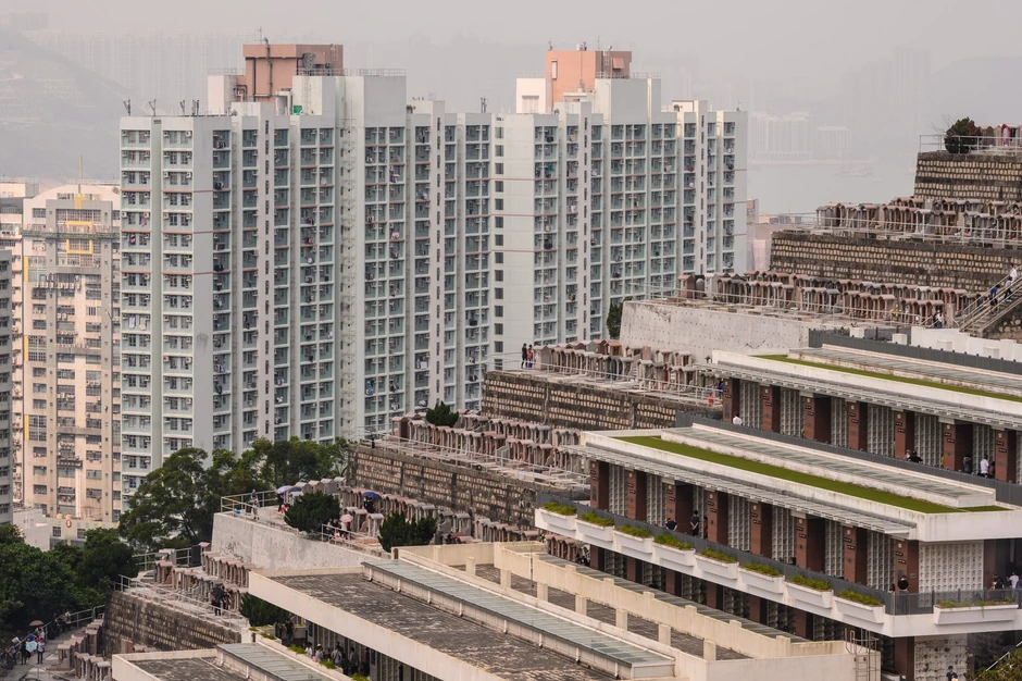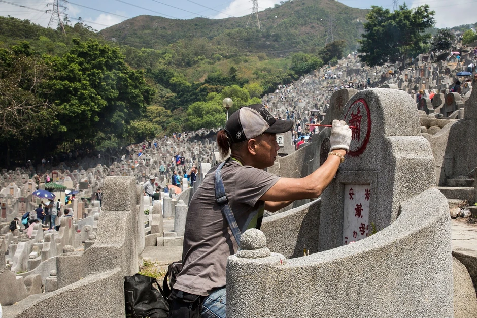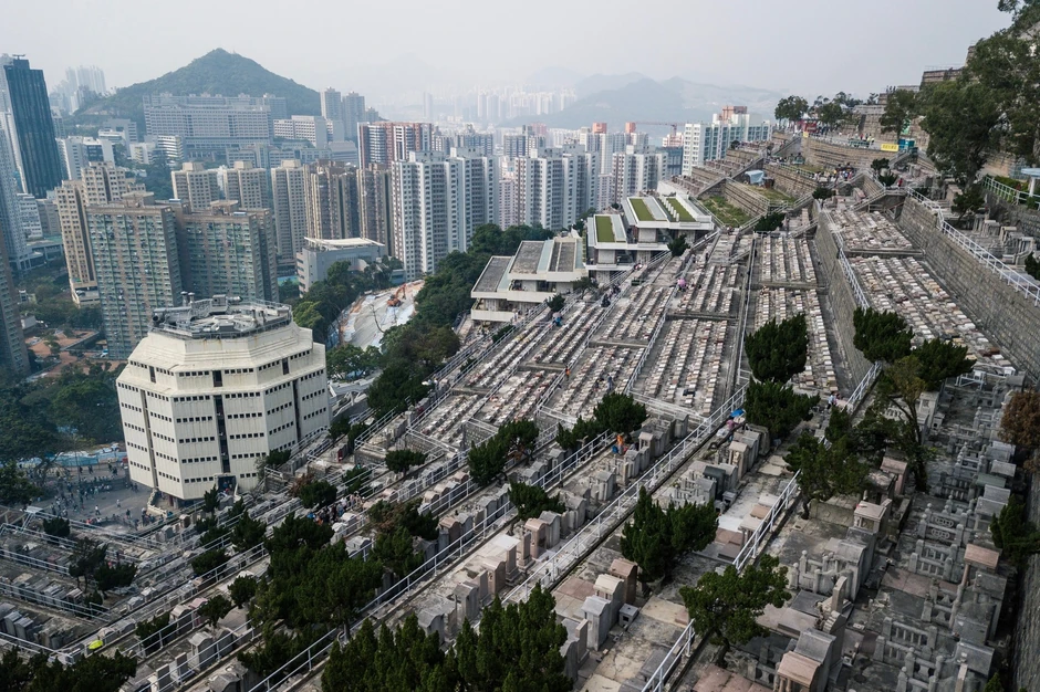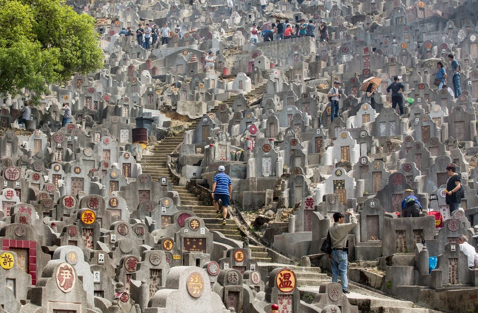 Padine brda u Hongkongu prekrivene su beskrajnim nizovima kamenih ploča, a samo ponegde se između mnoštva sivih kamenih blokova, u koja su ugravirana kineska slova, može videti drveće, koje iz daleka liči na zelene mrlje.