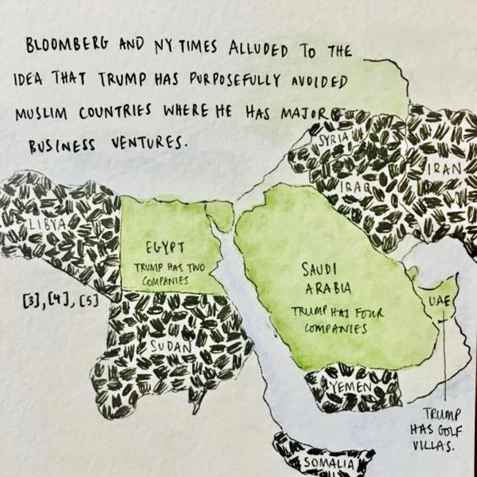 Na jednom od njih vidi se kako na mapi muslimanskih zemalja, među onima koje je Tramp stavio na crnu listu, nisu obeleženi Egipat i Saudijska Arabija, kao ni Ujedinjeni Arapski Emirati. Razlog je jednostavan: Tramp u njima ima ukupno šest kompanija i nekoliko velikih i luksuznih kompleksa sa golf terenima.