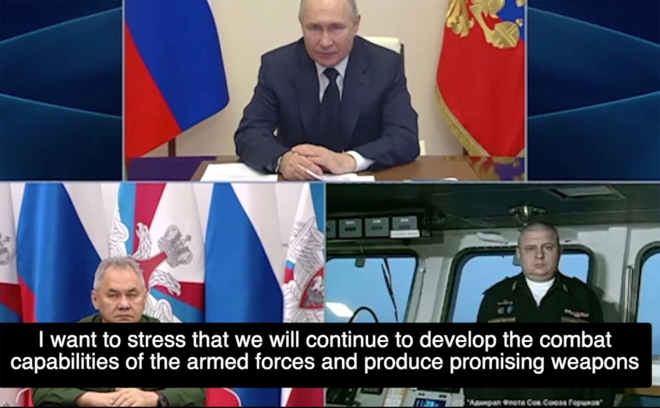 Zajedno s ministrom odbrane Sergejem Šojguom i Igorom Krokmalom, zapovednikom fregate "Admiral flote Sovjetskog Saveza Gorškov", Putin je na videokonferenciji rekao da je brod naoružan hipersoničnim oružjem.
