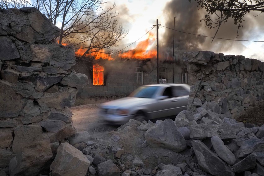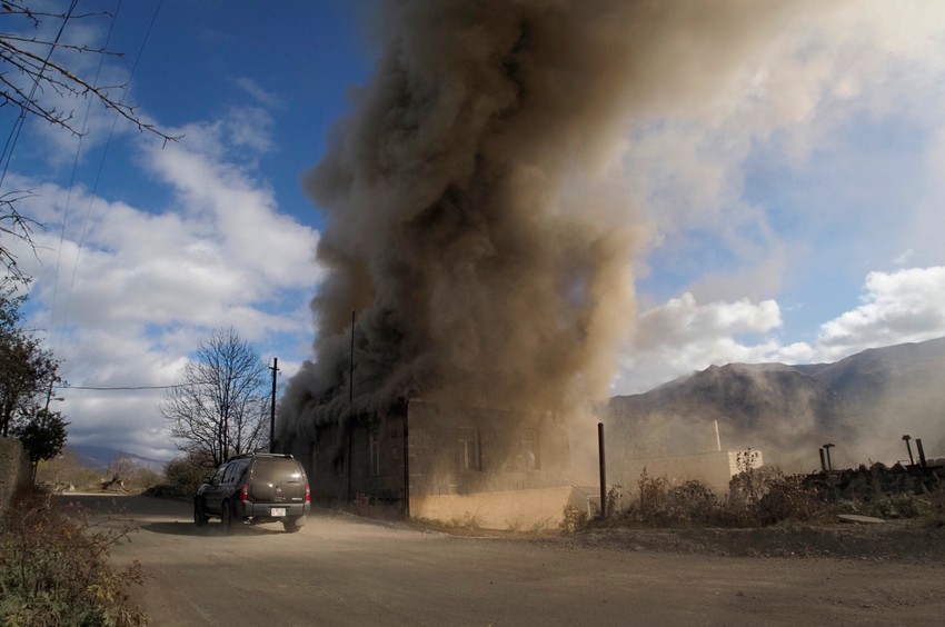 U selu Čarektar u Kalbadžaru, na granici sa distriktom Martakert koji će ostati pod jermenskom kontrolom, u subotu ujutro zapaljeno je najmanje šest kuća, dok se gusti dim dizao nad dolinom.