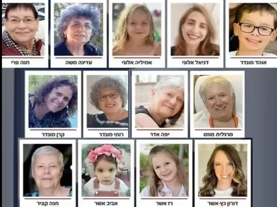 Izraelski taoci su identifikovani kao Čana Kacir (77), Margalit Mozes (77), Jafa Ader (85), Hana Peri (79), Adina Moše (72), Danijela Aloni (44), Emilija Aloni (9), Ruti Monder (78), Keren Monder (54), Ohad Monder (9), Aviv Ašer (2), Raz Ašer (5) i Dorin Kac-Ašer (34).