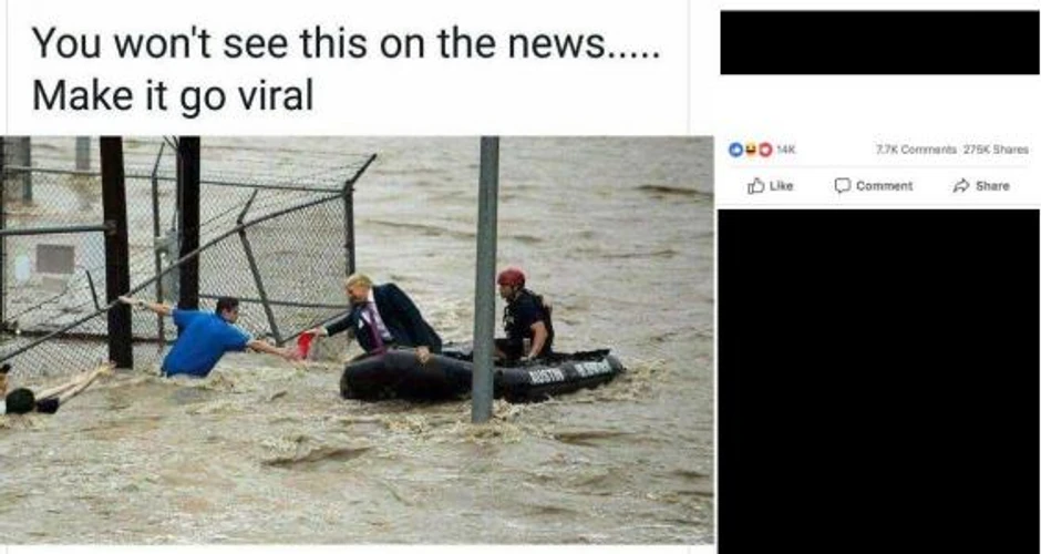 Naime oni su hiljadama puta podelili očigledno fotošopiranu fotografiju na kojoj navodno Tramp "pomaže" ljudima koji su ugroženi u poplavama nakon uragana Florens koji je pogodio istok SAD.