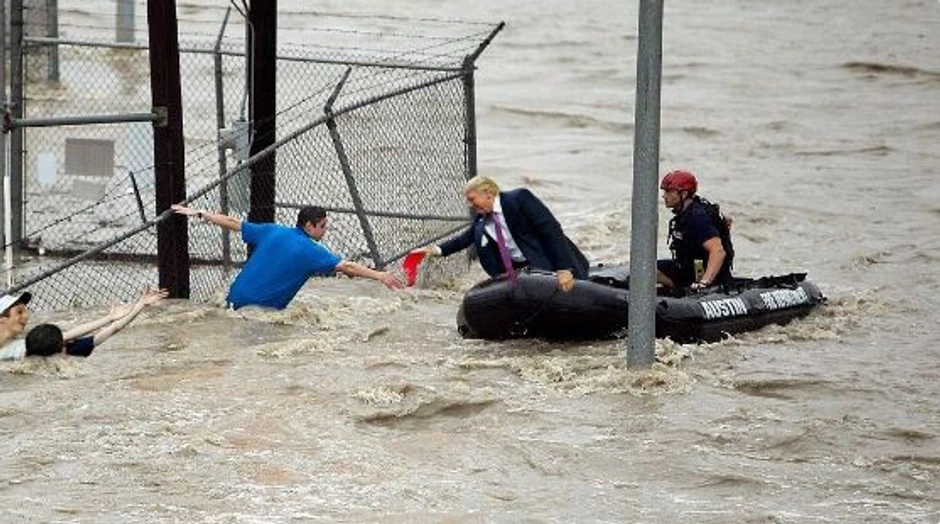 Prvo, zašto bi Tramp u odelu, a ne u spasilačkoj opremi išao čamcem da pomaže ljudima?