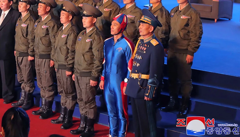 Kimu je, naime, ukrao šou čovek u uskom, plavom kombinezonu sa kacigom sa crvenim, belim i plavim prugama koji je stajao pravo pored oficira u standardnim, maslinastim uniformama, pozirajući za fotografiju. Još je samo jedan oficir sa njegove leve strane nosio plavu uniformu, iako standardnu.