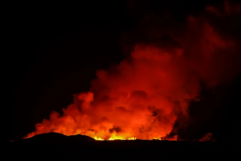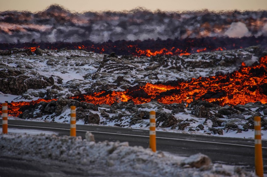 Slika koju je objavio islandski dnevnik Morgunbladid prikazuje jarko narandžastu rastopljenu lavu koja se izlazi iz pukotina u zemlji i izbija do 80 metara uvis.