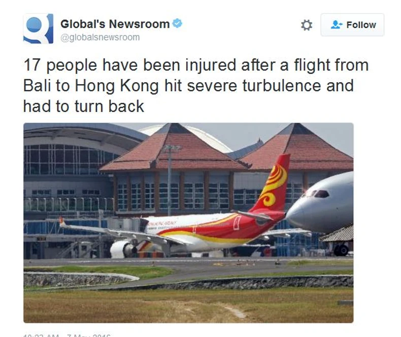 Na letu od ostrva Bali u Indoneziji do Hong Konga rano jutros 17 ljudi je povređeno kada su avion sa 204 putnika i 12 članova posade zahvatile jake turbulencije.