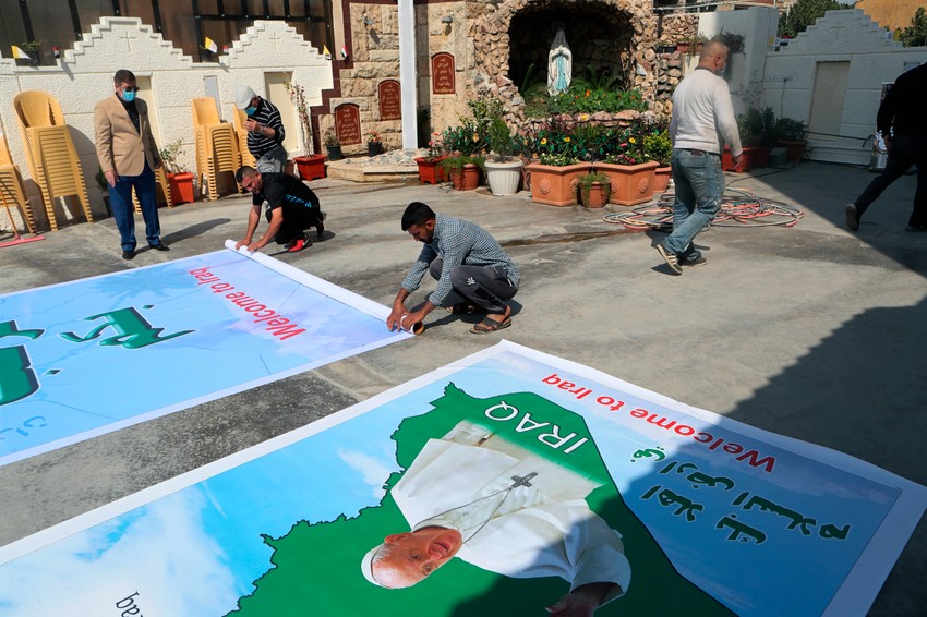 Na ulicama su postavljeni bilbordi i posteri sa likom pape Franje, a iračke i vatikanske zastave postavljene su na zgradama.