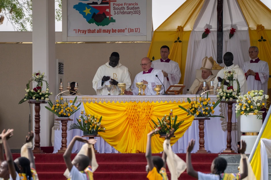 Papa je vodio misu na otvorenom na lokaciji mauzoleja posvećenog heroju oslobođenja Južnog Sudana Džonu Garangu, koji je poginuo u helikopterskoj nesreći 2005. On se u svom obraćanju pred oko 70.000 ljudi bavio temama pomirenja i uzajamnog opraštanja za nedela iz prošlosti. Okupljeni su pevali, a čuli su se i zvuci bubnjeva.