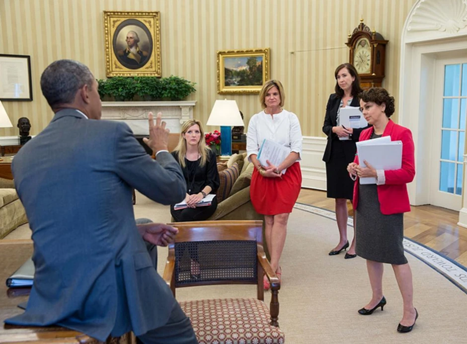 - Predsednik Obama razgovara sa savetnicom Bele kuće Keti Rumler, šeficom Odeljenja za komunikacije Dženifer Palmeiri i njenom zamenicom Birn Felon, kao i sa Sesilijom Munoz, savetnicom za unutrašnjom politiku - stoji ispod slike.