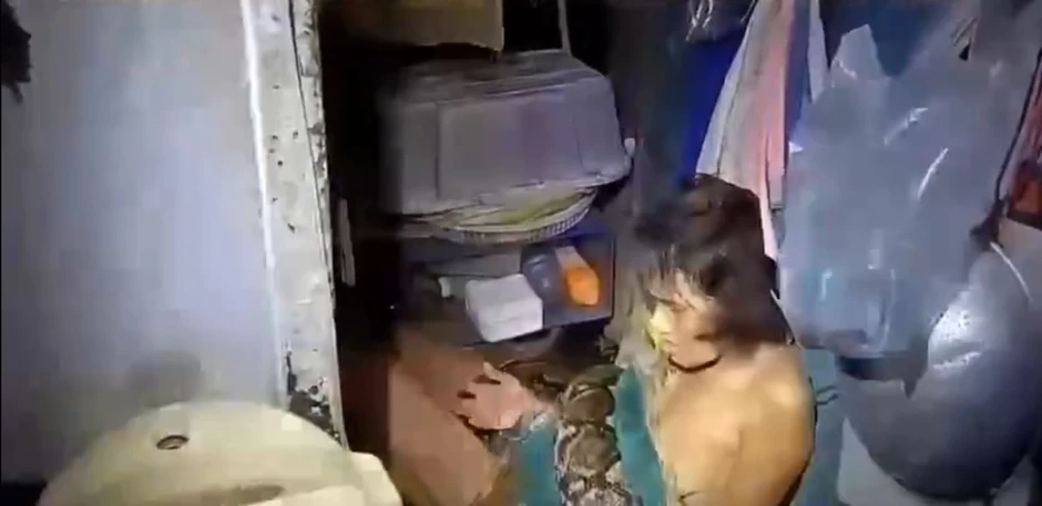 Piton je bio dugačak 4 metra. Na snimku koje su snimili spasioci vidi se žrtva kako sedi na podu sa zmijom omotanom oko struka.