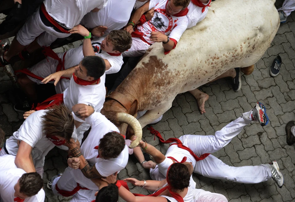 Povređeni trkači, u tradicionalnoj beloj odeći sa crvenim maramama oko vrata, spotakli su se jedni o druge ili su se okliznuli i pali dok su bežali gradskim uličicama pred šest snažnih, borbenih bikova.