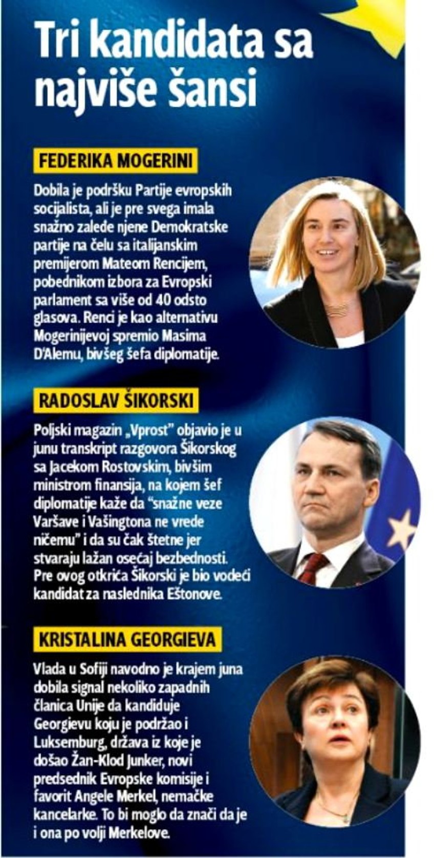 Kao alternativa se pojavila Kristalina Georgieva (61), bivša potpredsednica Svetske banke i aktuelna bugarska komesarka EU za humanitarnu pomoć, koja je u Srbiji boravila nakon poplava. U celom ovom lobiranju gotovo zaboravljen ostao je Radoslav Šikorski, šef poljske diplomatije, koji je snimljen kako vulgarnim jezikom govori o “bezvrednim” vezama sa SAD.