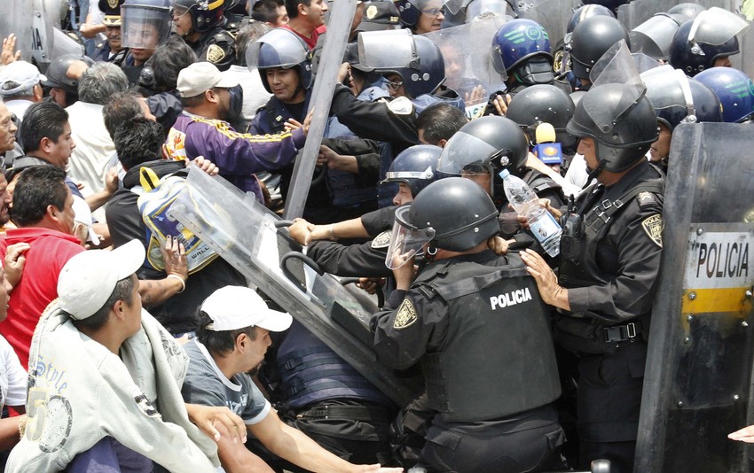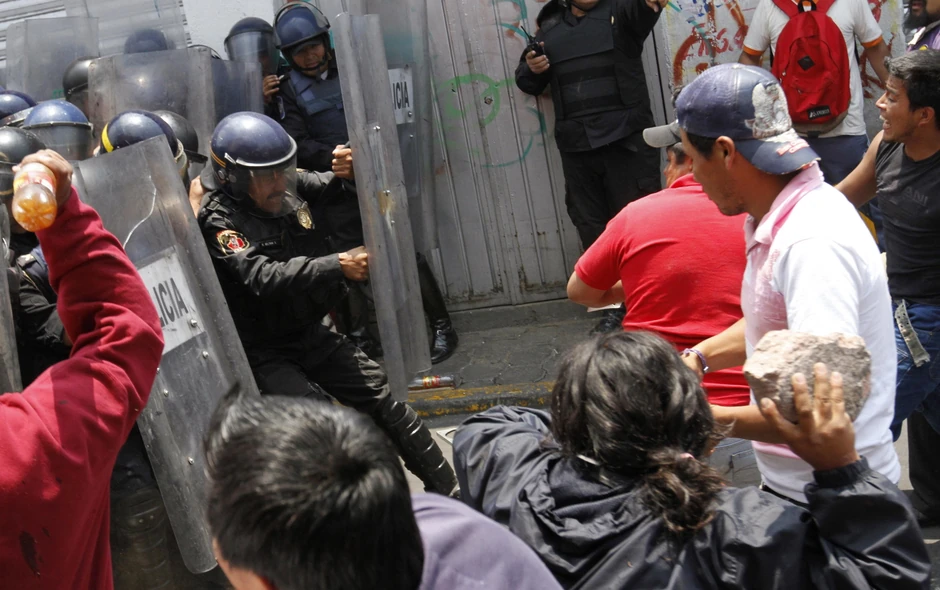 Policijaci su na kraju morali da potisnu seljane uz pomoć kaciga i štitova za demonstracije i suzavca.
