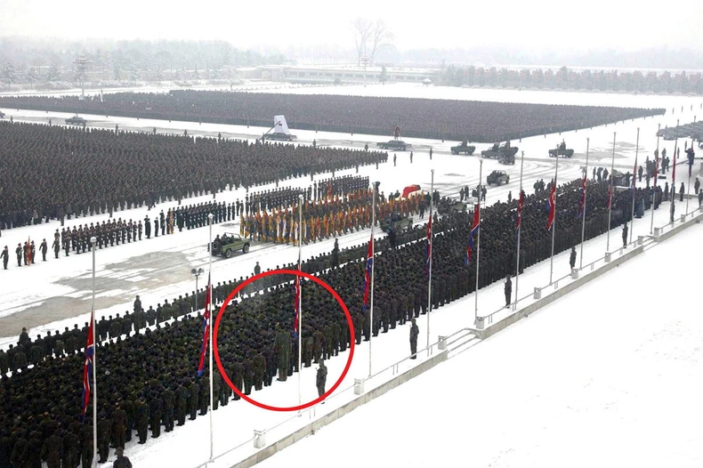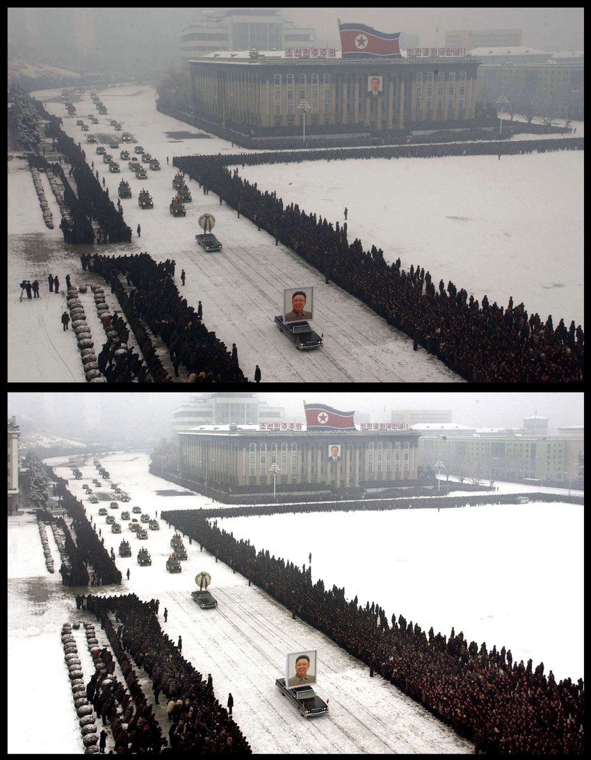 Osim toga, na desnoj strani donje slike se vidi da je dodatno izbeljen sneg kako bi svaki detalj sa sahrane "Dragog vođe" bio savršen i po ukusu propagandista u službi diktatorskog režima.