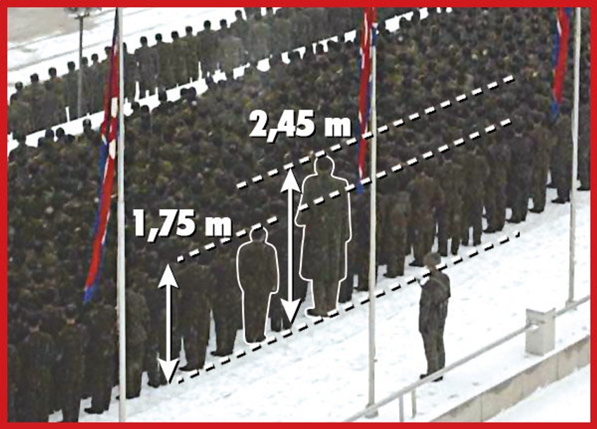 Na dodatno uvećanoj fotografiji vidi se da je ovaj džin bar za 30 do 40 odsto viši od svojih saboraca. Ako uzmemo da u poslednjem redu stoje najviši vojnici i da su oni prosečno visoki, na primer, 175 centimetara, poređenjem u "Fotošopu" dolazimo do zaključka da je misteriozni gigant visok bar 245 centimetara. Ako, pak, u poslednjem redu stoje najniži vojnici, kao što je običaj u srpskoj vojsci (hvala komentatorima koji su nam skrenuli pažnju na ovaj detalj), korejski džin bi mogao da bude visok oko 235 centimetara.