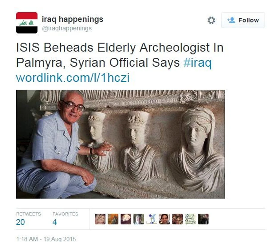 Pripadnici terorističke organizacije Islamska država pogubili su jednog od najistaknutijih stručnjaka za antikvitete Kaleda Asada (81) u sirijskom gradu Palmira, preneli su sirijski državni mediji.