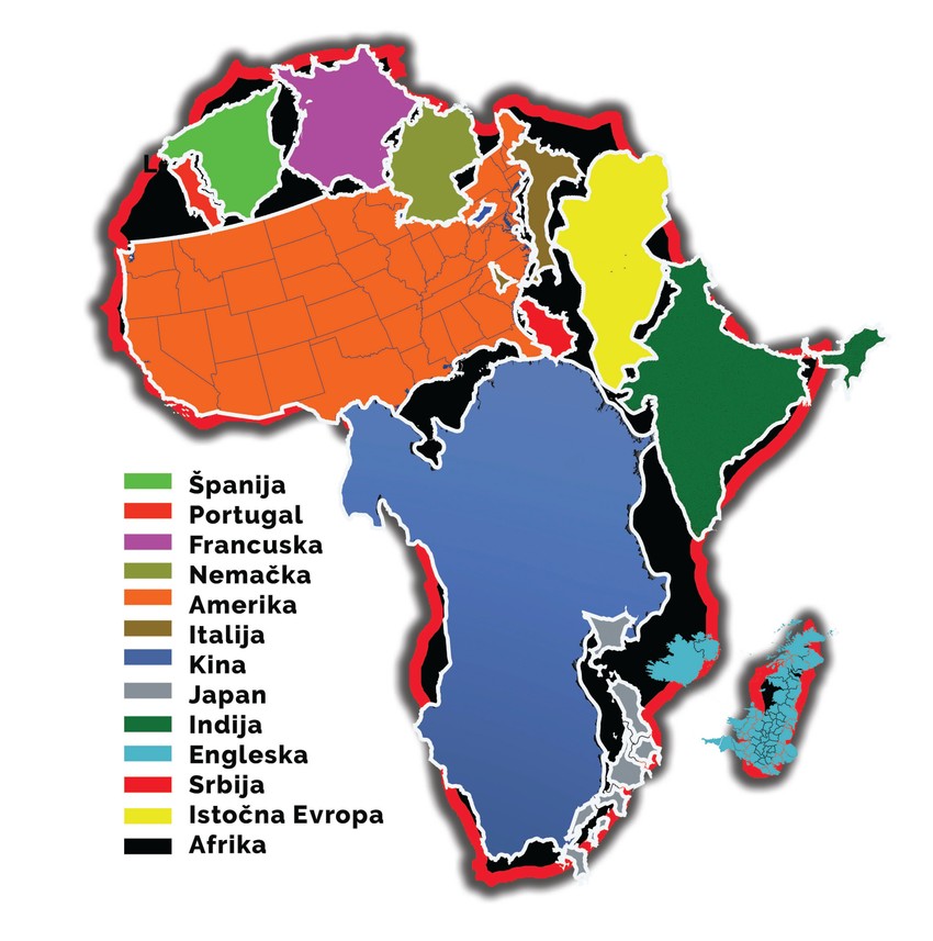 Ova infografika pokazuje pravu veličinu Afrike tako što je prikazano koje sve zemlje sveta mogu da se "smeste" u kontinent. Afrički kontinent ima kopnenu površinu od 30,37 miliona kvadratnih kilometara - dovoljno da stanu Amerika, Кina, Indija, Japan, Meksiko i mnoge evropske zemlje.