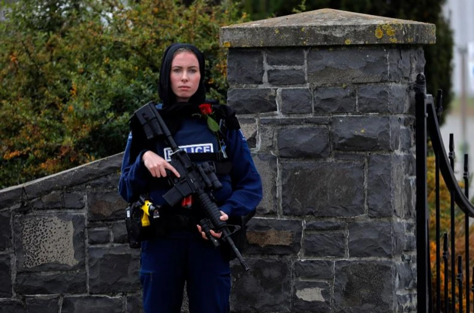 Fotografija policajke Mišel Evans, koja je čuvala stražu ispred groblja u Krajstčerču za vreme sahrana nekih od žrtava masakra koji je počinio brenton Tarant u dve džamije, privukla je veliku pažnju celog sveta.