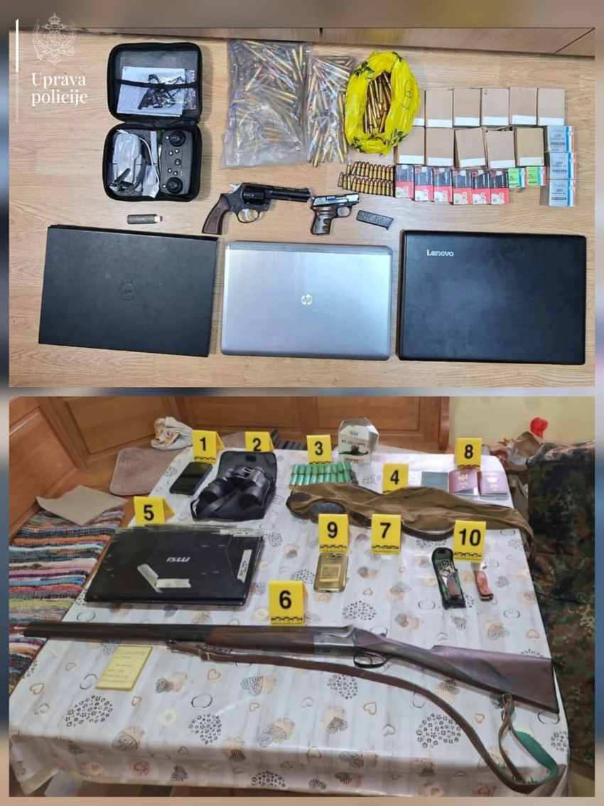 Kod Đ.V iz Nikšića je pretresom pronađeno: dva pištolja marke „Zastava", 803 komada municije, pištoljski okvir sa osam komada municije, USB memorija, dron i tri lap topa.