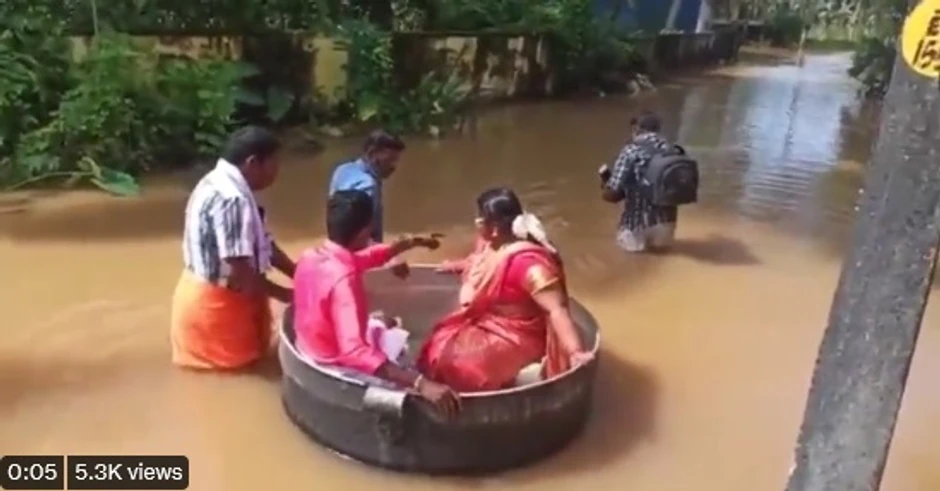Jedan indijski par došao je na sopstveno venčanje ploveći u ogromnom loncu, jer su ulice njihovog gradića Talavadija bile poplavljene.