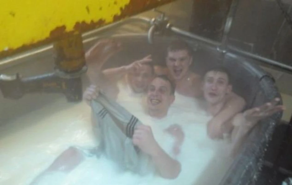 Na jednoj fotografiji vide se šestorica radnika kako se "brčkaju" u buretu, obučeni samo u gaće i podižu dva prsta u znak pobede.