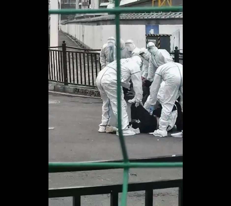 Vidi se kako policajci u zaštitnim odelima nasilno odvlače jednog stanovnika u ograđeni deo dok ljudi vrište i plaču, a prolaznici snimaju prizor.