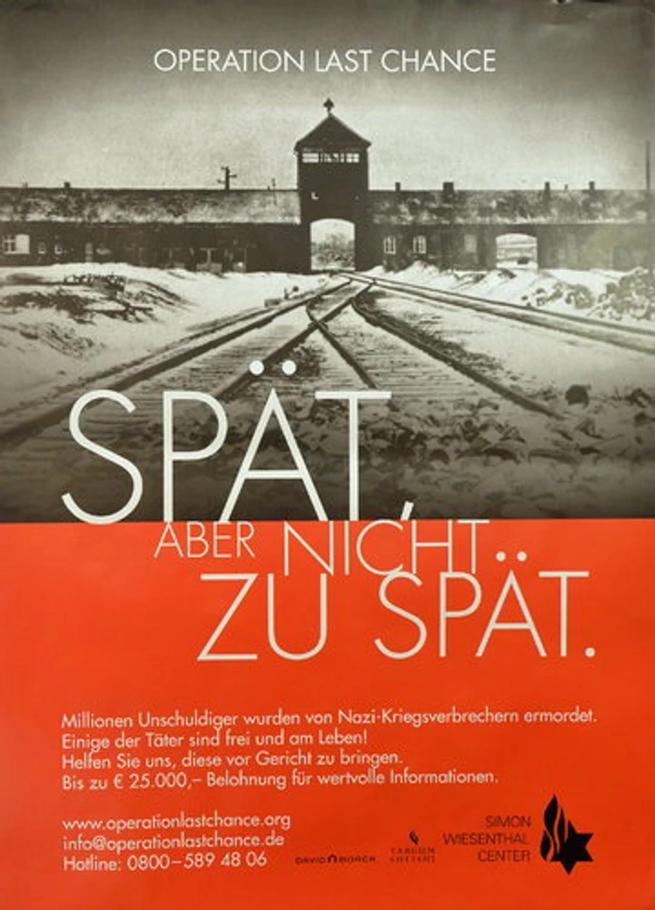 Centar “Simon Vizental” pokrenuo je kampanju posterima sa ciljem da se identifikuju Nemci u godinama koji su učestvovali u nacističkim zločinima. Do sada je došao do podataka o četiri osobe, uključujući i ženu koja je možda bila čuvar u logoru “Aušvic”. Kako je saopštila organizacija, informacije su prosleđene nadležnim organima radi dalje istrage.