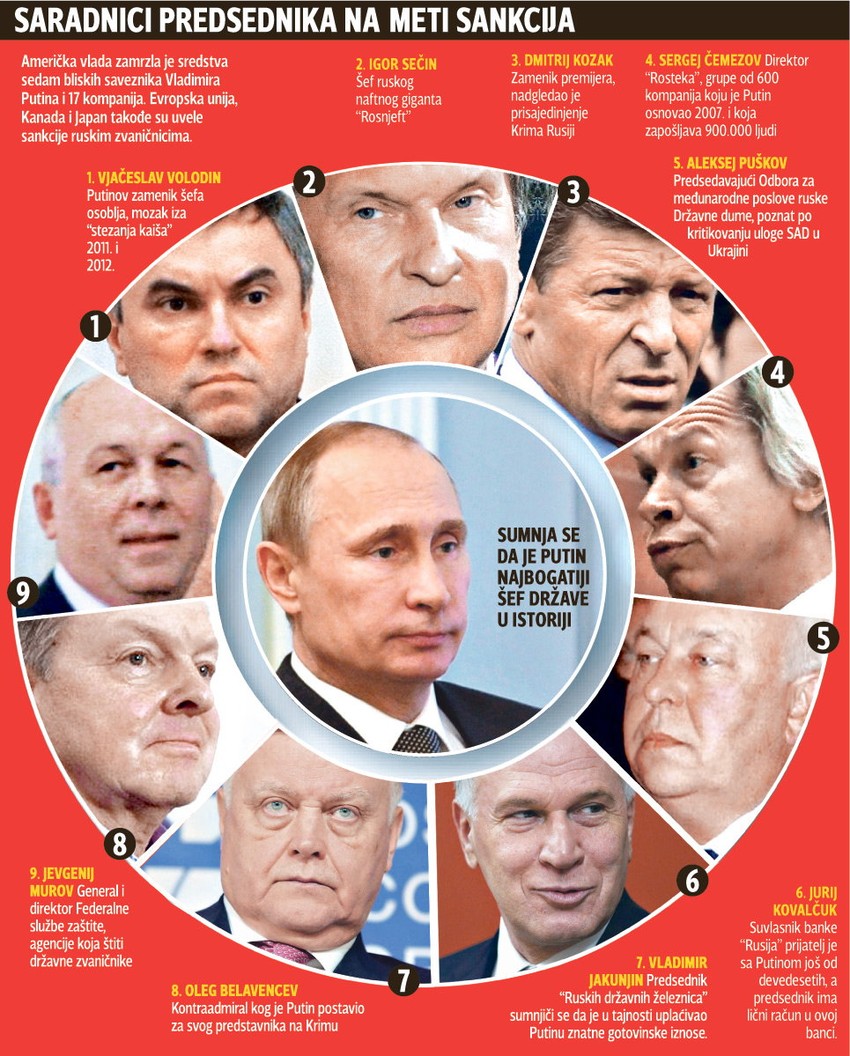 Na spisku imućnih Rusa za koje se sumnja da pripadaju finansijskim krugovima ruskog predsednika, pored Timčenka su se našli i Jurij Kovalčuk, Vladimir Jakunjin, kao i Arkadij i Boris Rotenberg. Prošle nedelje je najavljeno da će im se pridružiti Igor Sečin, predsednik naftne kompanije “Rosnjeft” i Aleksej Miler, šef energetskog giganta “Gasprom”.