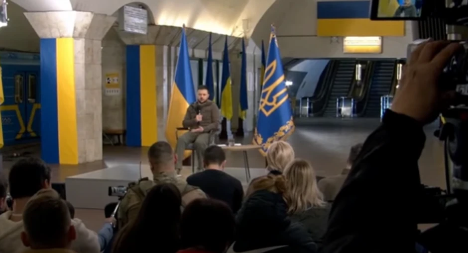 Zelenski se spustio do stanice pokretnim stepenicama i došao do bine sa stolicom i stočićem sa ukrajinskom zastavom pored kako bi odgovorio na pitanja novinara koji su napunili prostor ispred njega.