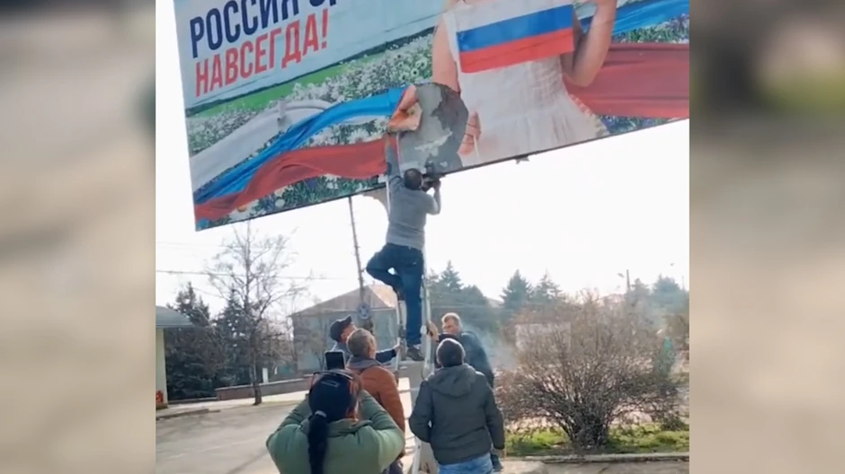 Na jednom od snimaka iz Hersonske oblasti, u selu Bilozerka, vidi se kako stanovnici skidaju bilbord na kojem piše da je "Rusija zauvek ovde".