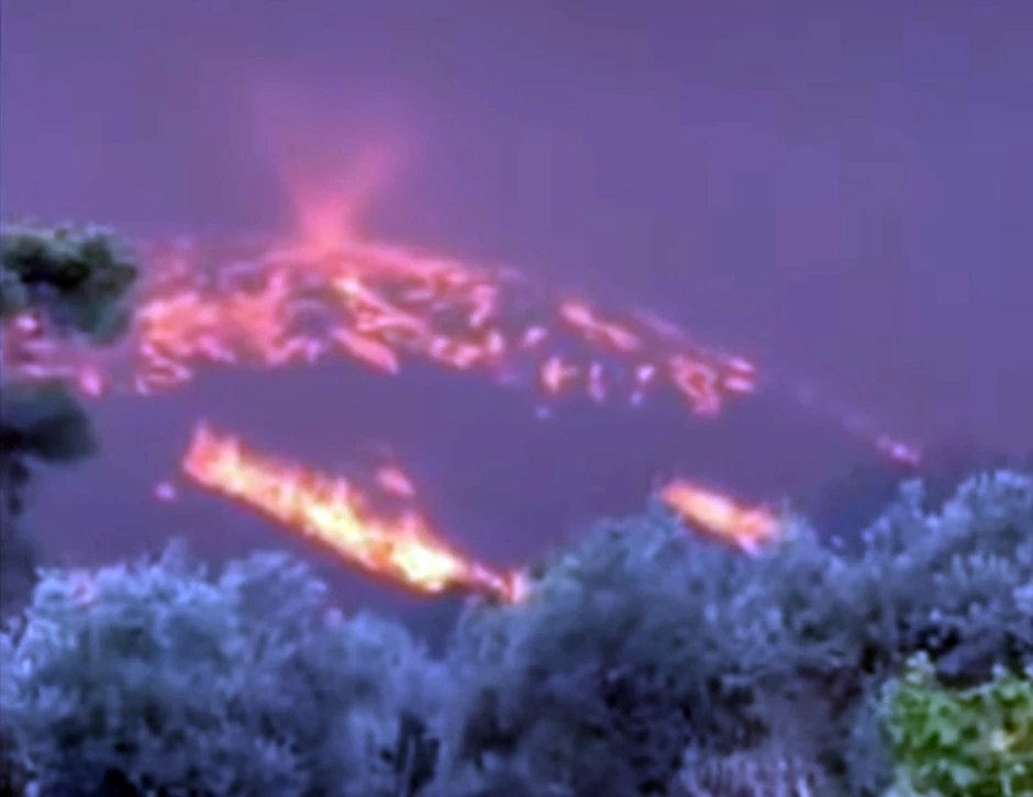Na videu koji je postavio "meteo.gr" vidi se vazduh koji nosi uskovitlani plamen kako se pretvara u vatreni tornado na vrhu brda koji gori zbog udara vetrova sa svih strana. Video pokazuje i plamenove koji se penju u neverovatni tornado sa svih strana zapaljenog brda.