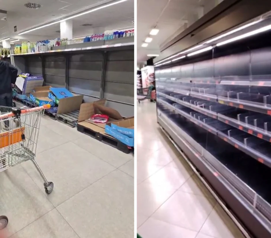 Tokom jučerašnjeg dana kupci supermarketa u Valensiji delili su fotografije praznih rafova u prodavnicama, a kako su za medije potvrdili čelnici velikih trgovinskih lanaca, več oko 11 ujutru je nestalo zaliha najpre vode, a potom i hrane i drugih osnovnih potrepština.