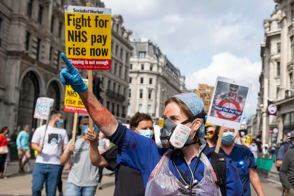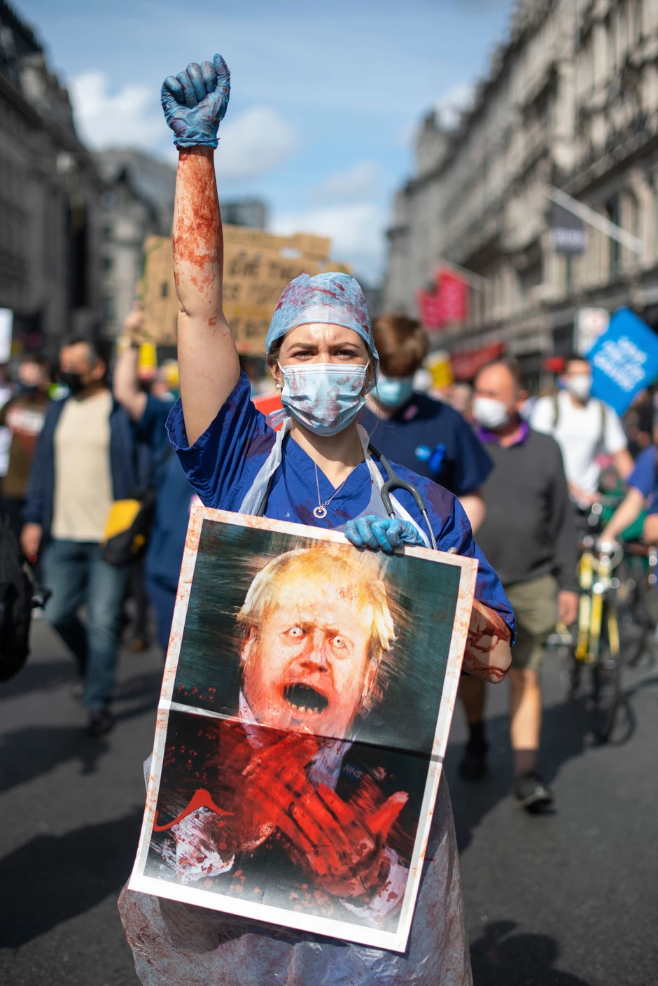 Mnogi radnici u centru Londona nosili su uniforme i transparente "Prestanite da aplaudirate i počnite da plaćate", kao i "640 zdravstvenih radnika je umrlo, krv je na njihovim rukama" uz fotografiju premijera Borisa Džonsona i ministra za kabinetske poslove Majkla Gova.