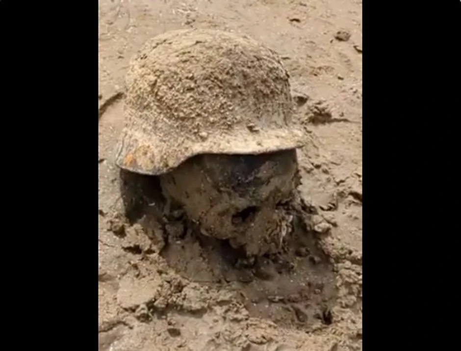 Na snimku se vide ljudske lobanje u pesku, od kojih neke još imaju vojne šlemove na sebi. Dodaje se da u blizini verovatno ima još mnogo ljudskih ostataka iz vremena kada su Sovjeti uništili branu Zaporožje 1941.
