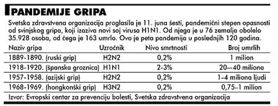 – Nema velike razlike. Grip A/H1N1 je zahvatio mnoge zemlje, ali to još nije pandemija, kako smatraju u SZO, pošto se bolest odvija kao i svaka godišnja epidemija bilo kog drugog gripa. Premda rast obolelih od svinjskog gripa raste u svetu, samo kod malog procenta ishod je smrtonosan. Za medicinske stručnjake je to niski nivo rizika, koji se može uporediti sa bilo kojim drugim oblikom gripa.