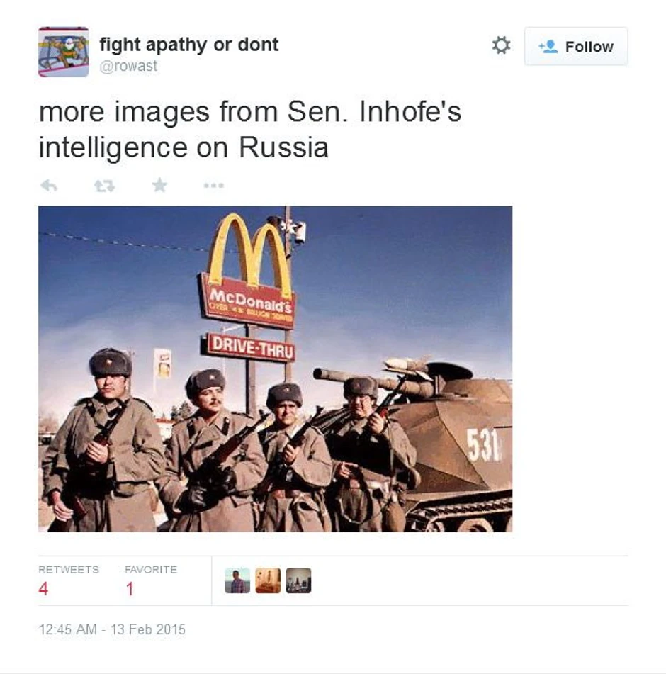 Poslanici ukrajinskog parlamenta prevarili su američkog senatora, republikanca iz Oklahome Džejmsa Inhofija (Inhofe), predajući njegovim saradnicima fotografije navodnog konvoja ruske vojne tehnike kao dokaz za rusko vojno prisustvo na istoku Ukrajine, preneli su ruski mediji.