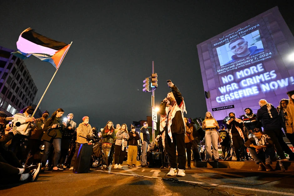 U Vašingtonu je ispred hotela Vašington Hilton, dok je trajala godišnja svečana večera za novinare u organizaciji Bele kuće, održan protest protiv američke politike povodom rata u Pojasu Gaze.