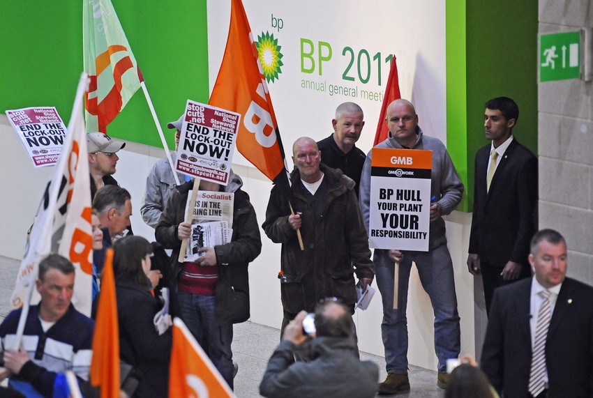 Akcionari BP postavljali su članovima upravnog odbora pitanja o bezbednosti i merama za zaštitu okoline. Pojedini demonstranti pokušali su da upadnu za govornicu tokom sastanka, a jedan je fizički udaljen sa skupa.
