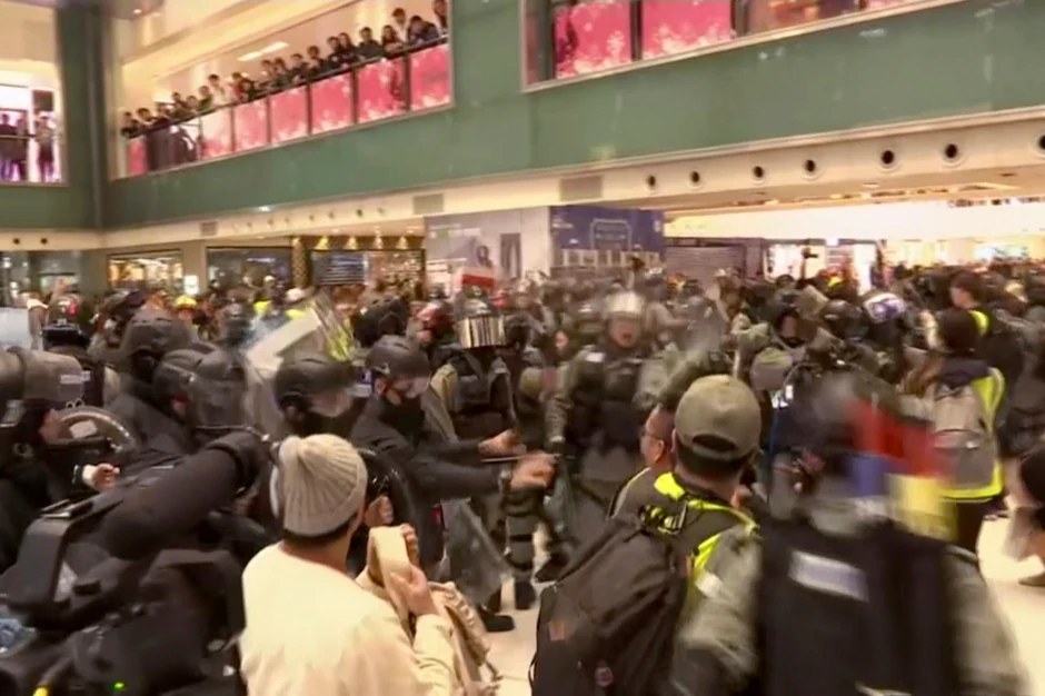 U tržnom centru "Ša Tin" policija je uhapsila dvojicu tinejdžera, te oborila jednu stariju ženu nakon što je izbila tuča kada je jedan kupac pokušao da spreči demonstrante da ispisuju grafite, javlja AFP.
