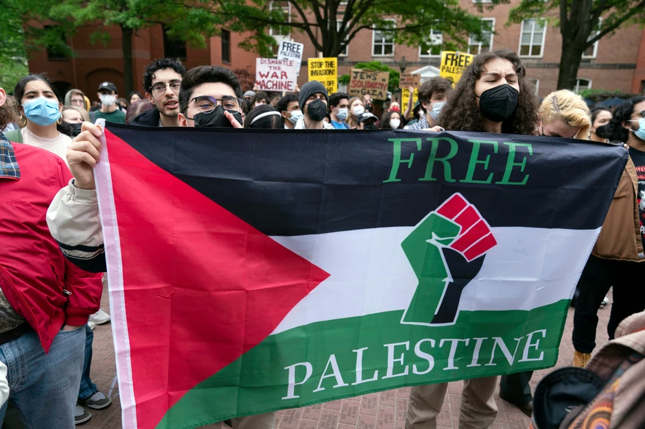 Demonstranti su uzvikivali slogane podrške palestinskom narodu i istakli palestinske zastave na prozorima i iznad zgrade univerziteta.