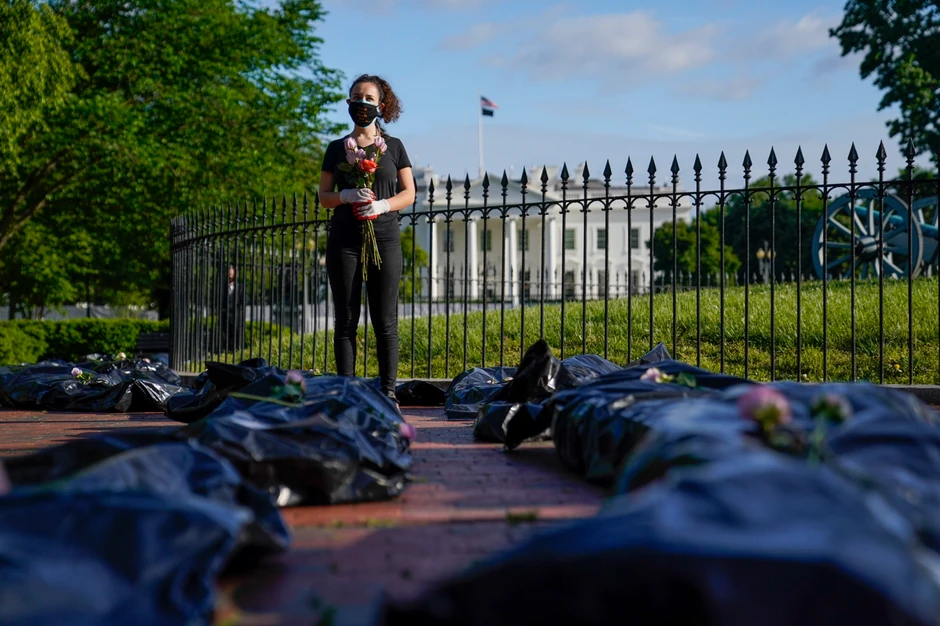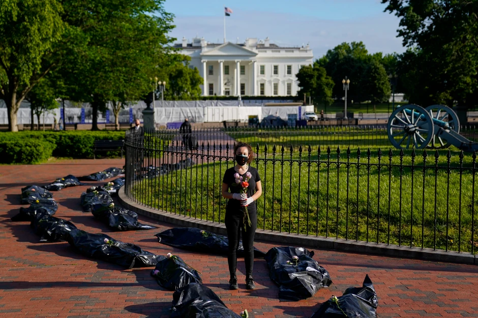 Demonstranti ispred Bele kuće položili su obeležene mrtvačke vreće na kojima je pisalo "Tramp-kovid-smrt", iskazujući tako nezadovoljstvo načinom na koji je Trampova administracija rešila pandemiju virusa kovid-19.