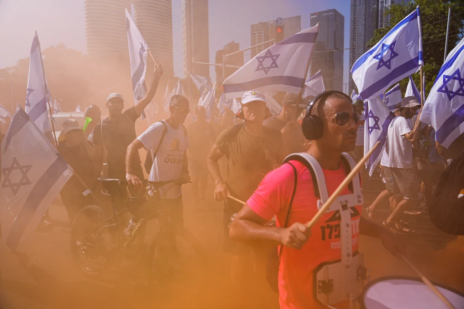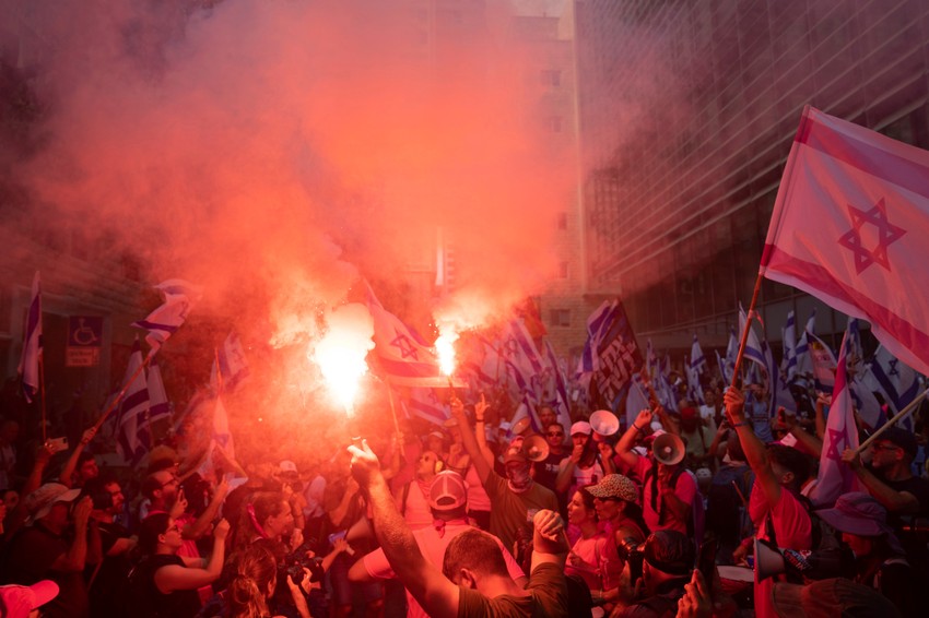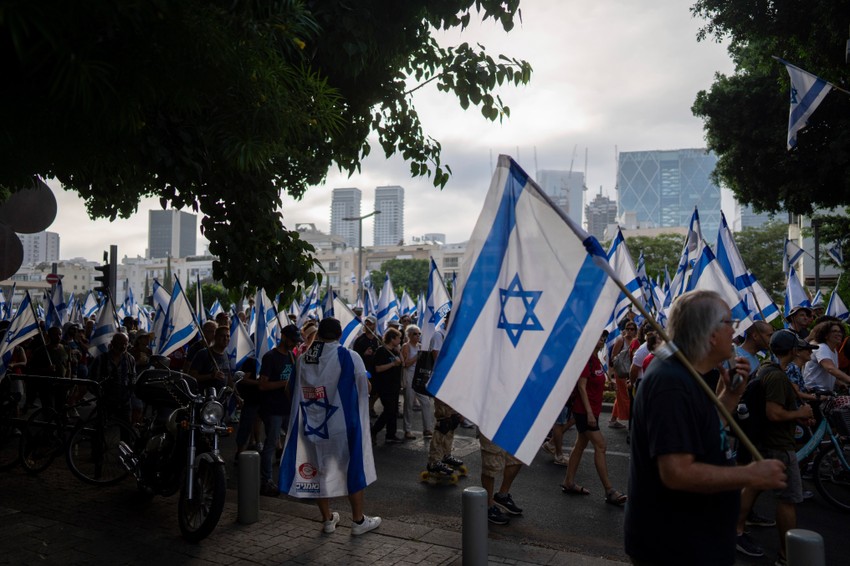 Ispred berze u Tel Avivu, okupljeni demonstranti su sa transparentima palili dimne bombe, trubili i skandirali, navodi AP.