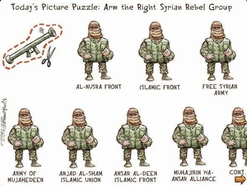 Naime, na zvaničnom Tviter profilu ove ruske ambasade objavljen je crtež na kome je prikazano osam pripadnika različitih pobunjenički grupa u Siriji.