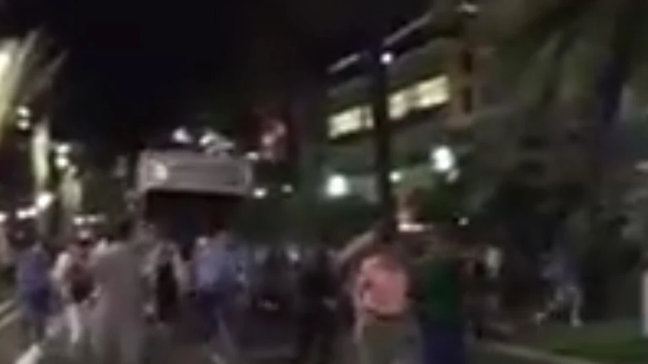 Na snimku se vidi kako prolaznici uživaju u proslavi, što prekida kamion smrti koji počinje da obara pešake.