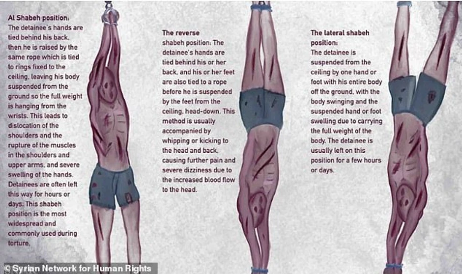 Zarobljenici su navodno više dana visili u raznim položajima. Terani su da čuče ili stoje na jednoj nozi, a potom su ih tukli, saopšteno je iz SNHR-a. Žrtvama je uskraćivana medicinska nega, nisu mogli da se tuširaju i koriste toalet. Neke žrtve su bile složene jedna na drugu i izložene gladovanju.