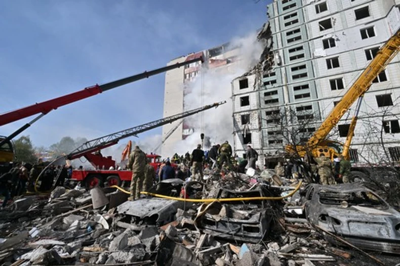 U Umanju, gradu koji je uglavnom pošteđen ruskog napada, devetospratnica se delimično srušila nakon što je pogođena projektilom.