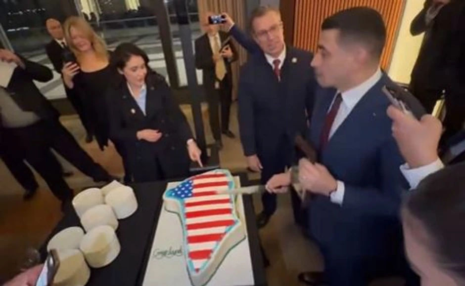 Na zabavi održanoj u utorak u Vašingtonu, grupi republikanskih poslanika poslužena je torta u obliku Grenlanda, prekrivena američkom zastavom.