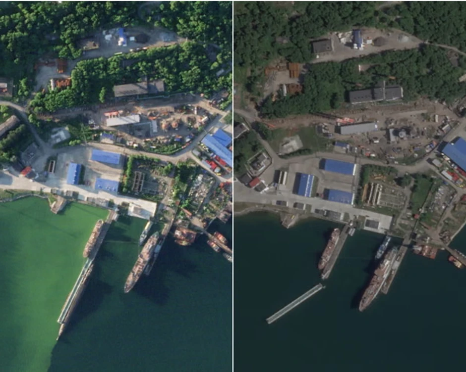 Fotografije koje je snimila kompanija Planet Labs, komercijalna firma za satelitsko snimanje, prikazuju oštećenja na plutajućem pristaništu u bazi Ribačiji na poluostrvu Kamčatka.